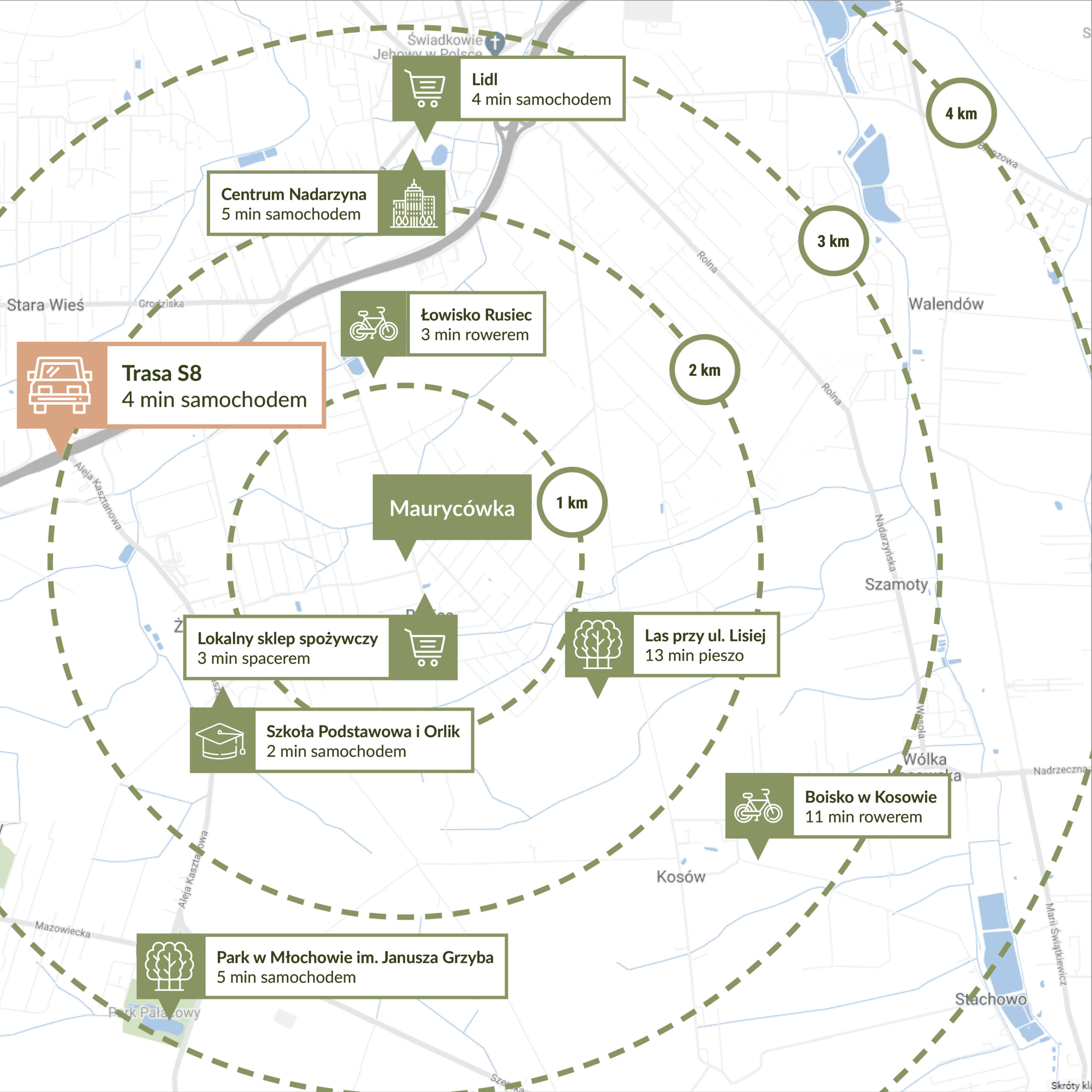 Maurycówka znajduje się w kameralnej miejscowości Rusiec, w gminie Nadarzyn, przy ul. Głównej. To spokojna, świetnie skomunikowana lokalizacja – tylko 3 minuty będą dzielić Cię od trasy ekspresowej S8, dzięki czemu szybko i wygodnie dotrzesz m.in. do centrum Warszawy. Równie blisko strefa Park&Ride w Nadarzynie, pozwalająca komfortowo korzystać z transportu publicznego.