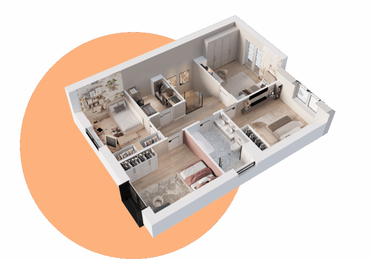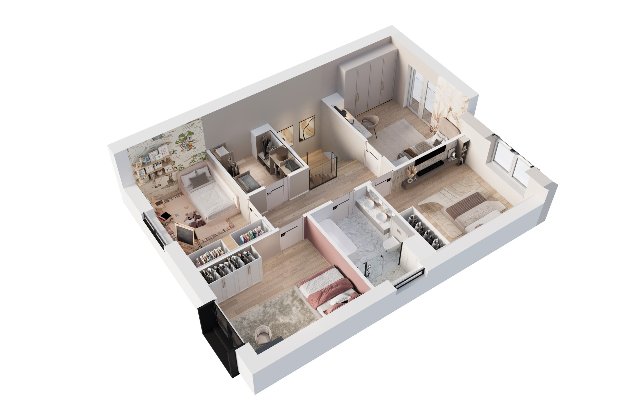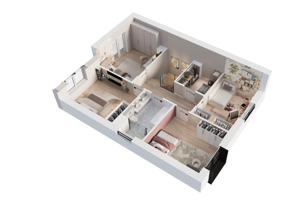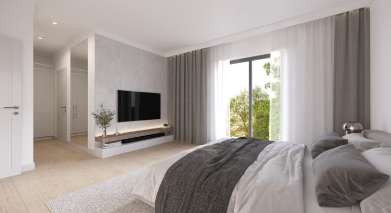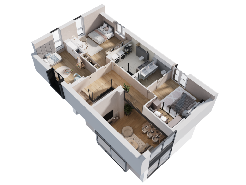 W zależności od wybranego wariantu, piętro domu oferuje 3 lub 4 sypialnie. Dzięki opcji przesunięcia ścian działowych, możesz w pełni dostosować układ wnętrz do swoich potrzeb. Wysokie pomieszczenia potęgują wrażenie przestronności, a duże okna sprawiają, że wnętrza są jasne i przytulne od rana do wieczora.