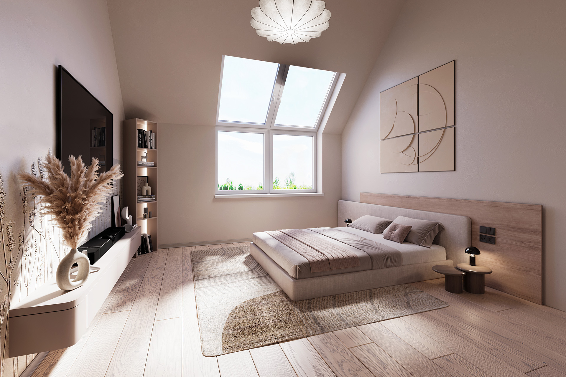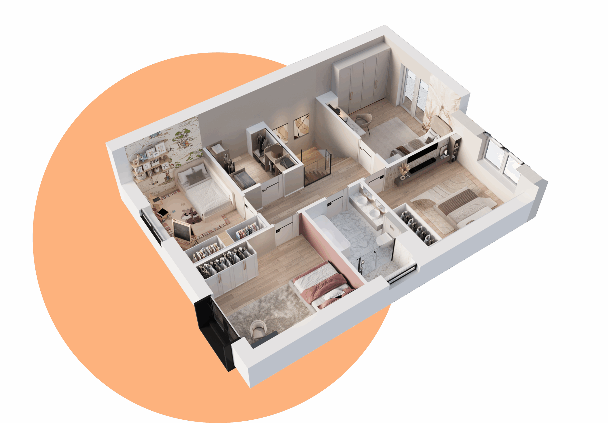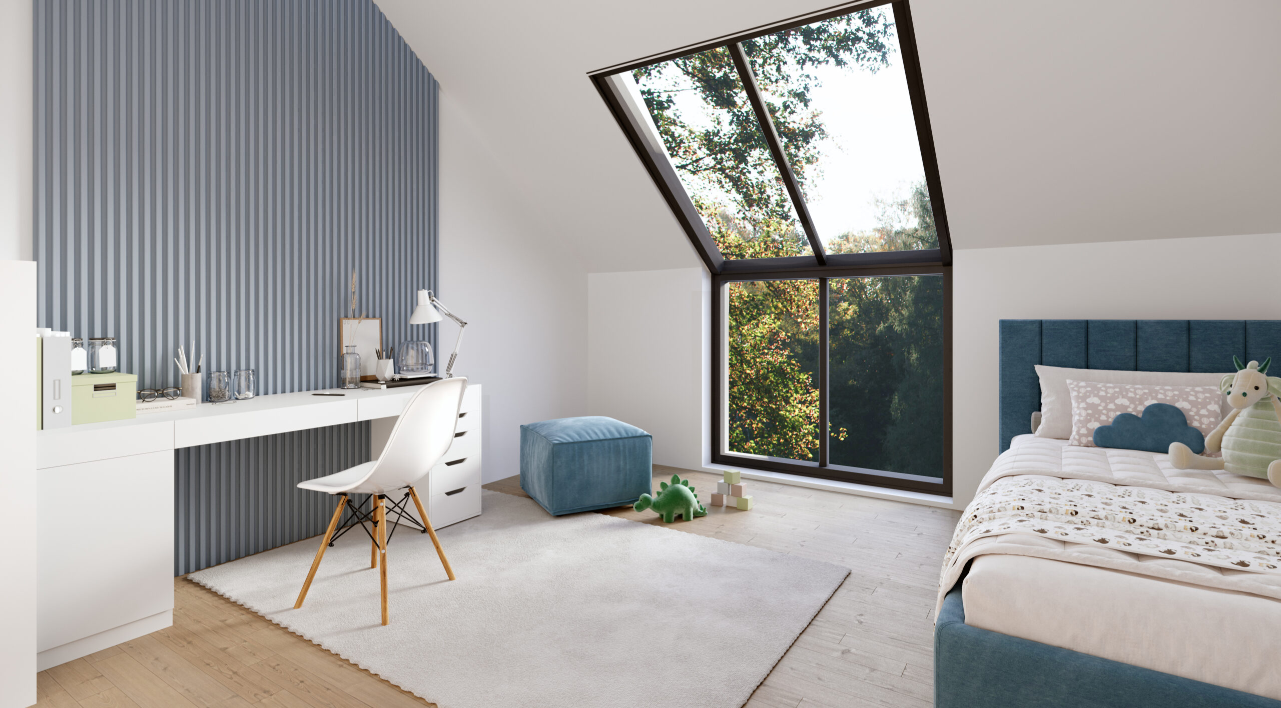 W zależności od wybranego wariantu, piętro domu oferuje 3 lub 4 sypialnie. Dzięki opcji przesunięcia ścian działowych, możesz w pełni dostosować układ wnętrz do swoich potrzeb. Wysokie pomieszczenia potęgują wrażenie przestronności, a duże okna sprawiają, że wnętrza są jasne i przytulne od rana do wieczora.