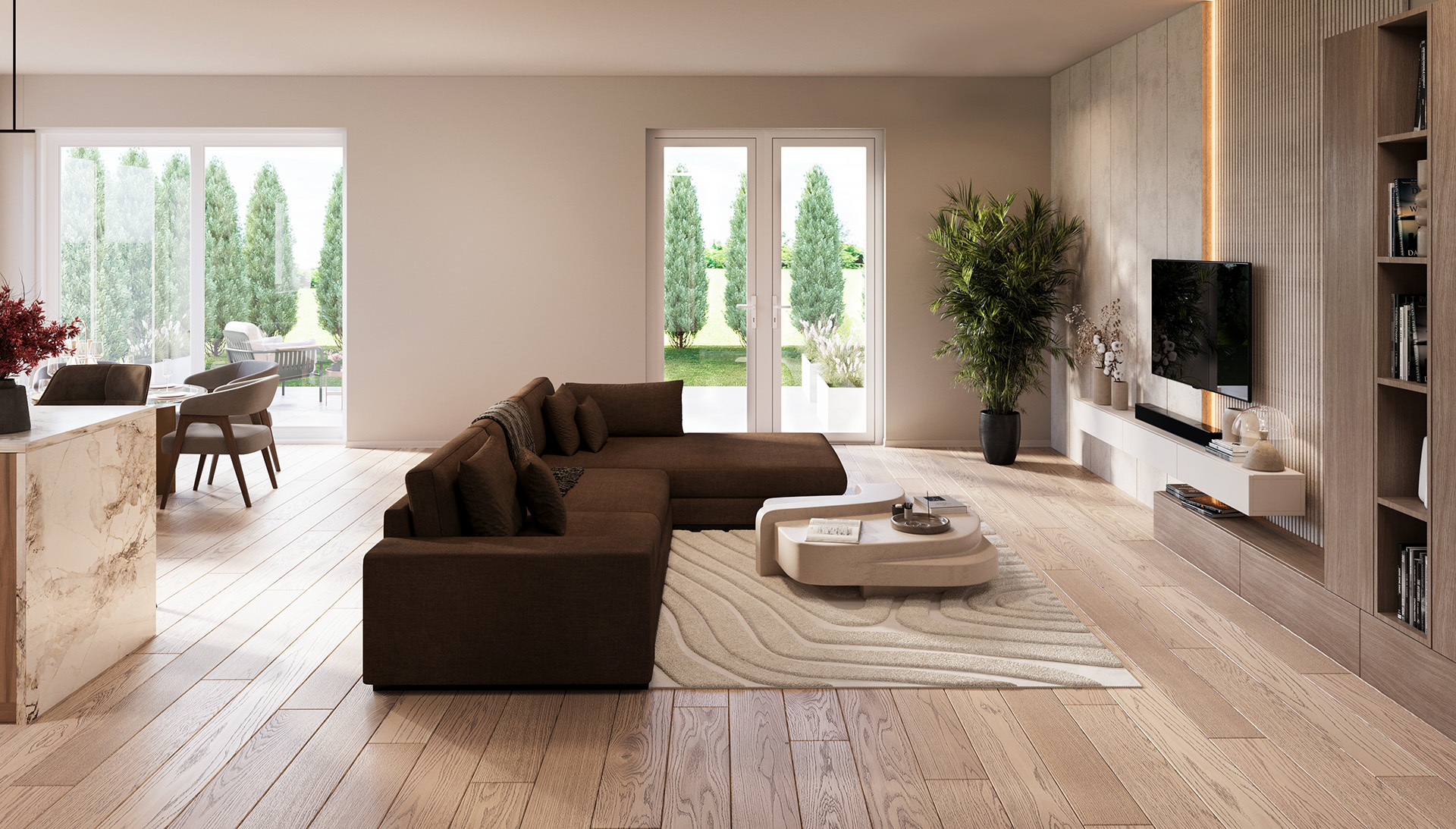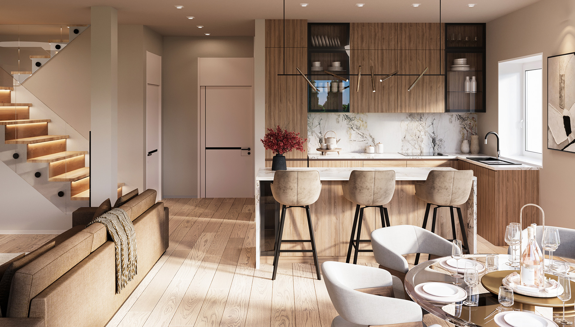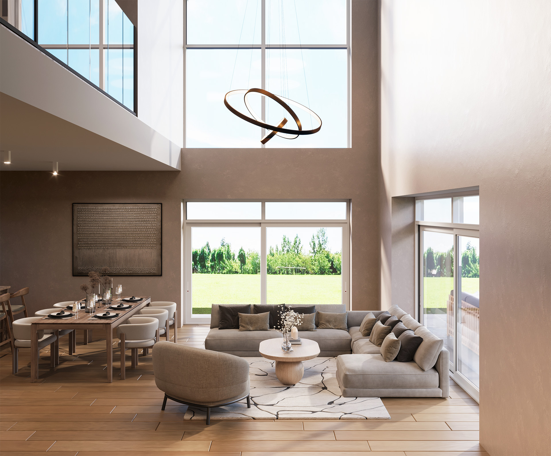 Domy w Maurycówce to przemyślana przestrzeń, która zachwyca funkcjonalnością i komfortem. Powierzchnie domów zaczynają się od 150 m², a ich sercem jest słoneczny salon z aneksem kuchennym – idealne miejsce do celebrowania chwil z bliskimi.