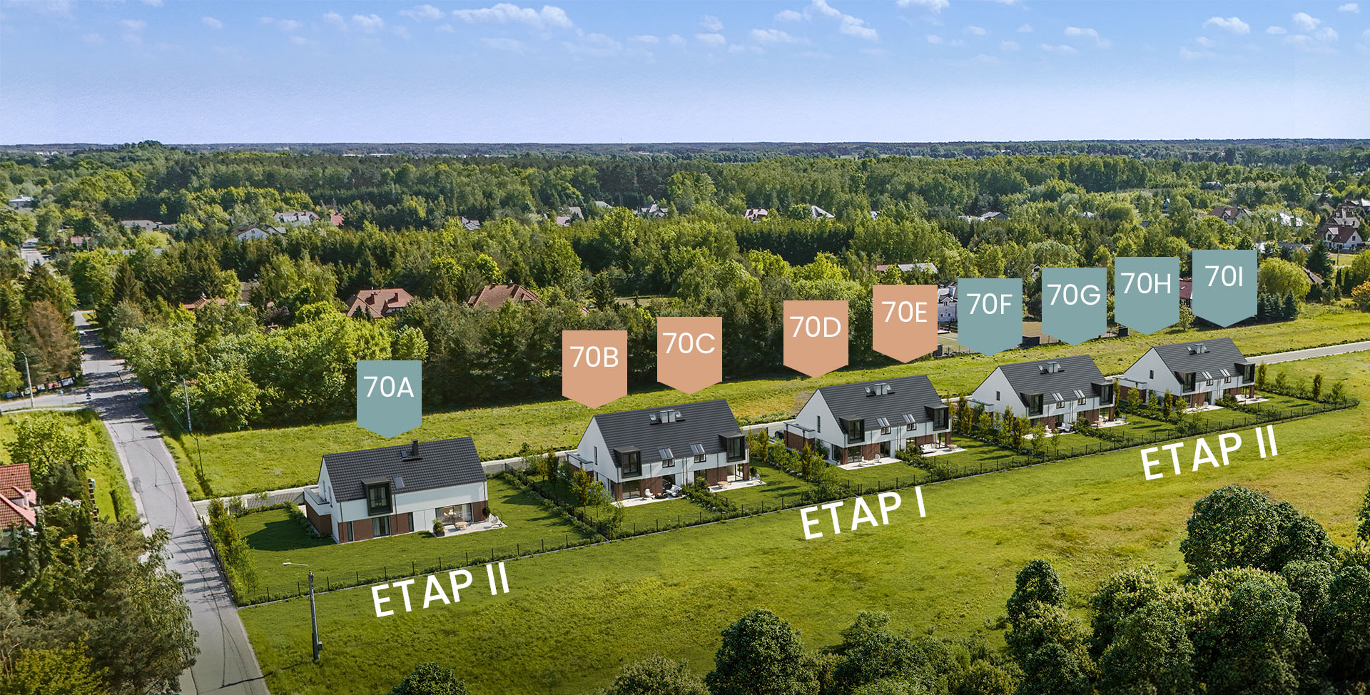 | 70E | Dom-lewy | 0 | 4 | 147,99m2 | 500m2 | Ogród | 70E | 350,00m2 | I etap | Sprzedane | -- |